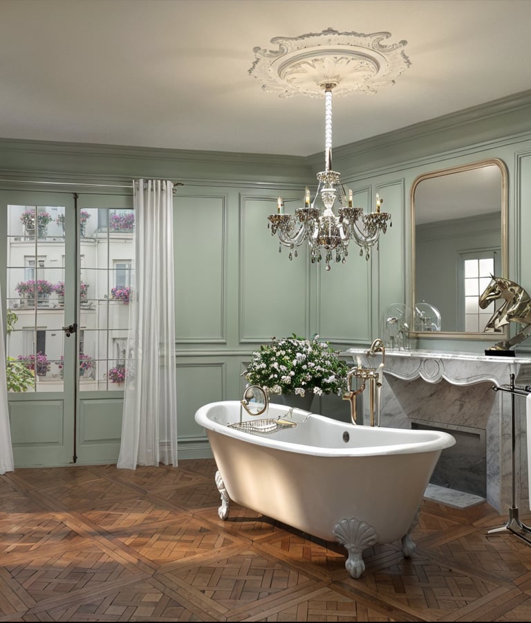 Au cœur de cette pièce somptueuse trône une magnifique baignoire à pattes de lion, véritable pièce maîtresse et symbole du raffinement parisien. Pour parfaire l'intimité de cette pièce, de larges rideaux peuvent être tirés créant un cocon privé où l'on peut se ressourcer en toute tranquillité. Un système de son intégré permet de diffuser de la musique douce, ajoutant à l'ambiance relaxante.